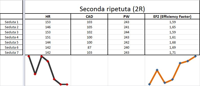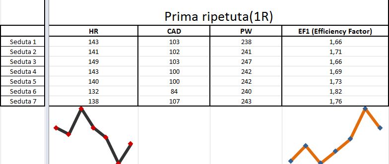 Noterete anche che con il passare delle sedute(tabella sotto) la frequenza cardiaca (HR) dell’atleta scende a parità di potenza erogata; si noti anche il grafico nella colonna HR (in discesa).